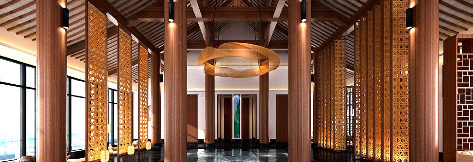 柔和光線背景下的幾何藝術圖案衍生成超級逃逸和空靈的畫面形象,激發(fā)更深層次的冥想。天花裝飾采用竹裝飾板手工編織,體現了展館的自然精神和終極美學。
